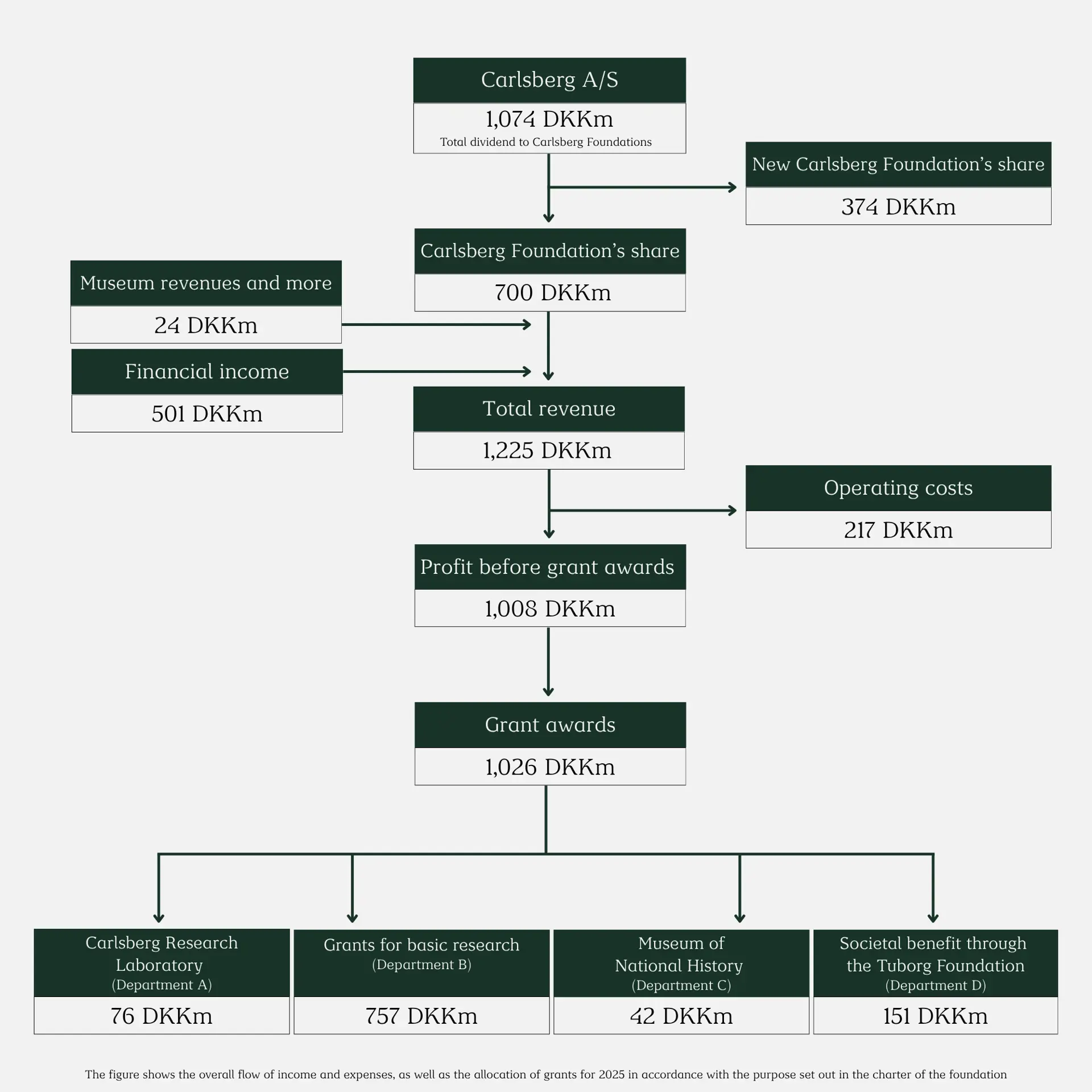 The total amount of the Carlsberg Foundation’s annual funding for grants depends on the dividends on the foundation’s shares in Carlsberg A/S. This is supplemented with revenue from other financial activities, which are affected by the global economy and its impact on the financial markets.