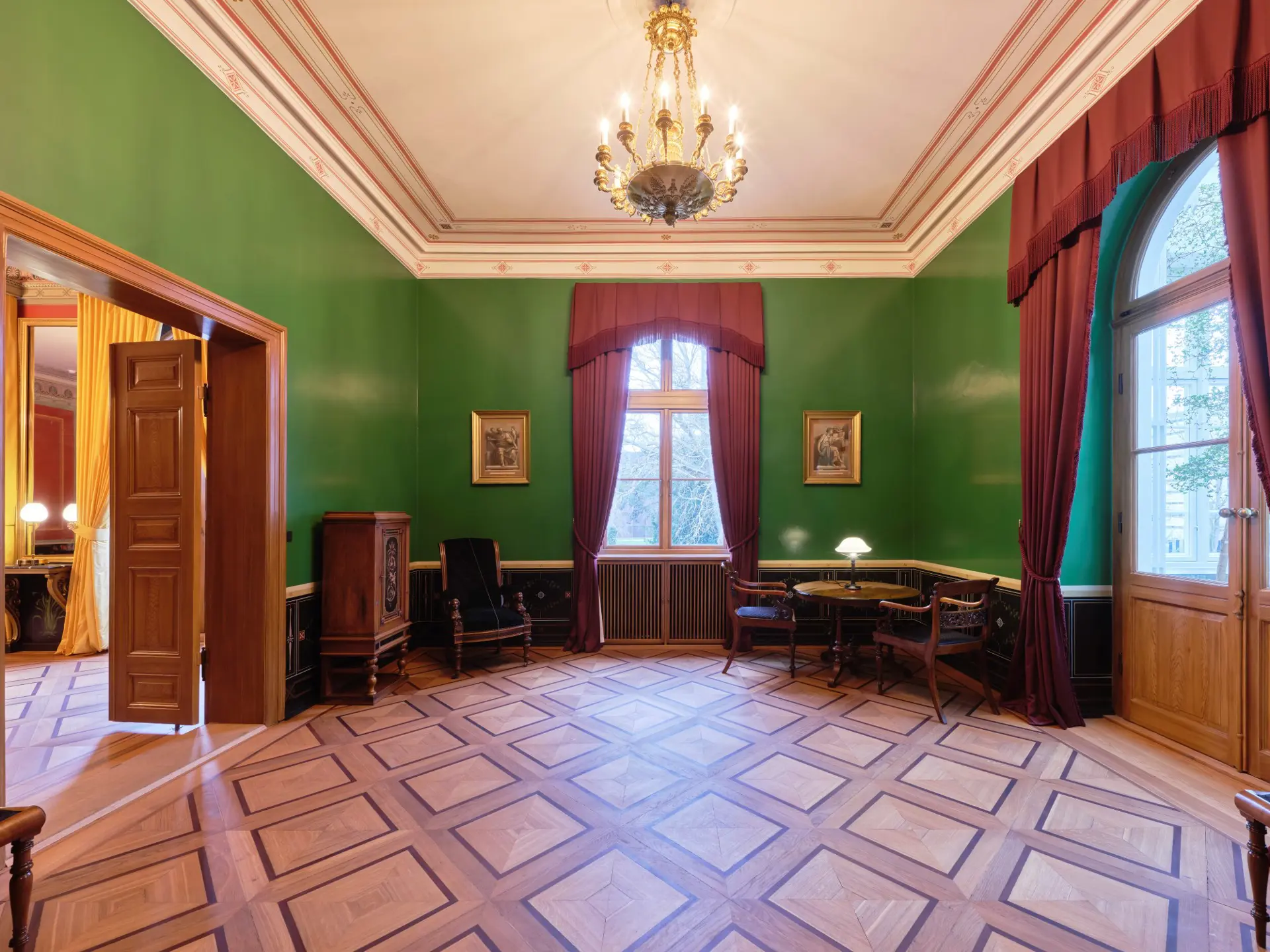 Villaens spisesal har fået restaureret de særegne dekorationer med både ornamenter fra bryggerens tid samt blomsterranker, der blev tilføjet kort før, Niels Bohr flyttede ind i villaen i 1932.