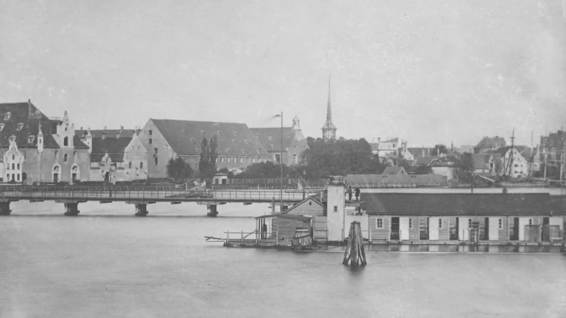 Rysensteen Badeanstalt ved Langebro. Man kan se Børsens tårn i baggrunden, og billedet stammer antageligt fra begyndelsen af 1900-tallet. Foto: Christian Rasmus Neuhauss/Københavns Museum