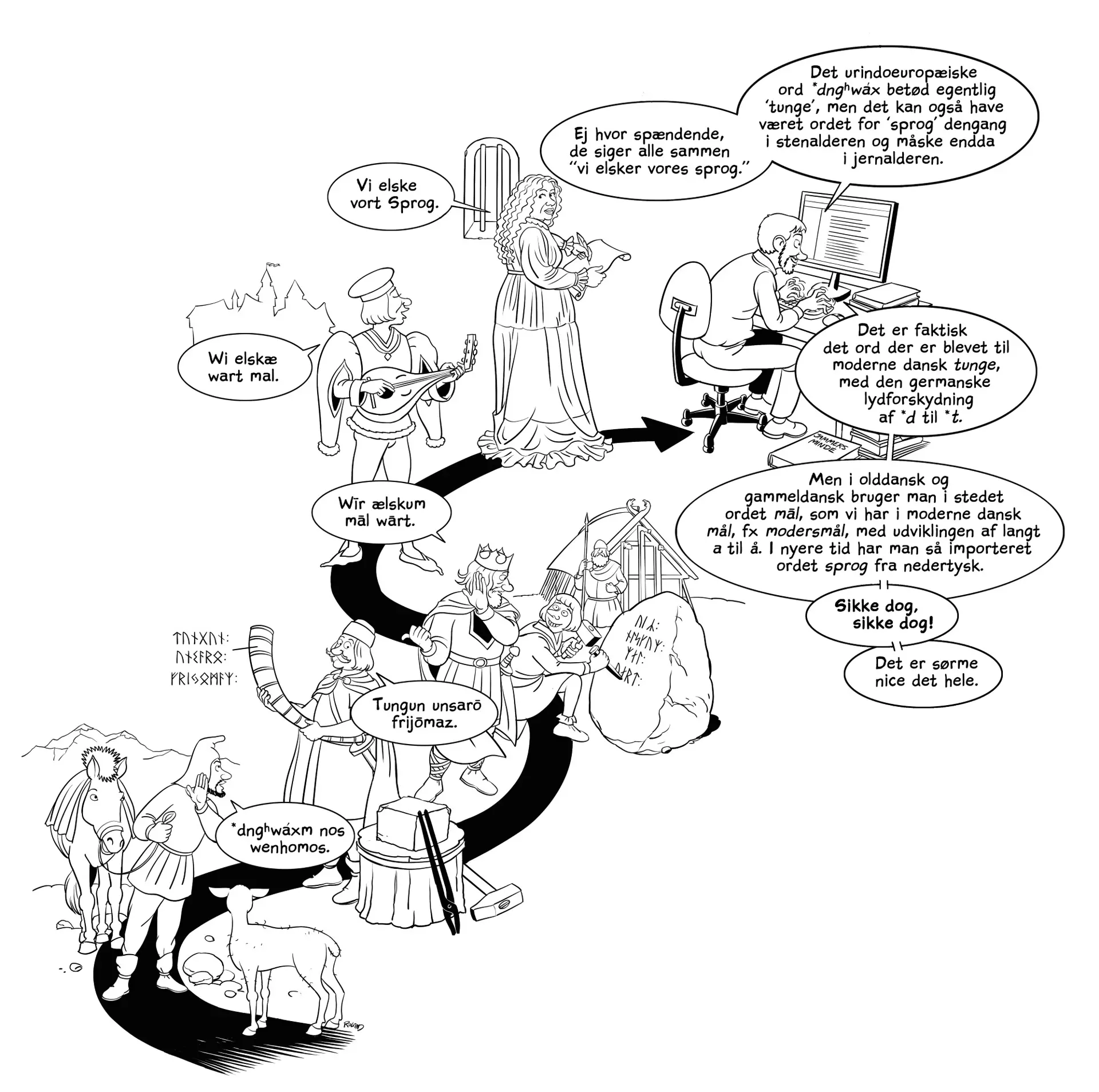 “Når vi skal gå tilbage i tid og spore for eksempel dansk, starter vi med lydene. Lydudvikling er helt grundlæggende, for det giver nogle metoder til at rekonstruere sproget bagud i tid. Lydene er ikke interessante i sig selv, men de er byggestenene til ordforråd og bøjning. Det er vores rekonstruktion af lydene, vi er sikrest på,” forklarer Thomas Olander.